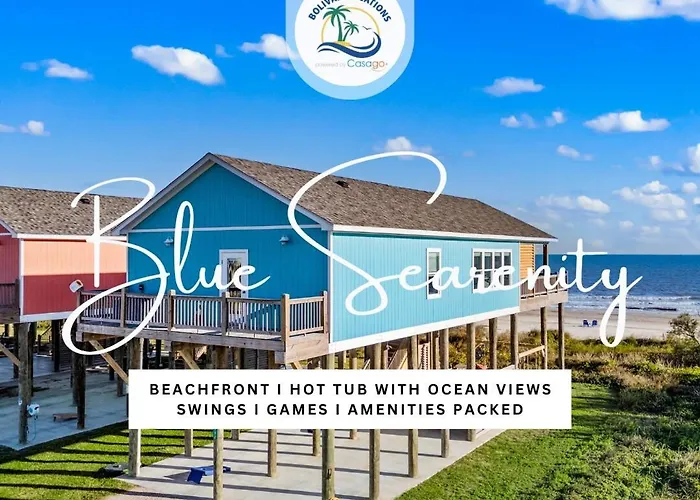 **Welcome to the Beachfront Retreat Hottub Swings Picture Perfect - Blue Searenity, a coastal haven nestled along the serene shores of Bolivar Peninsula.** This enchanting retreat boasts captivating views of turquoise waters, inviting sandy beaches, and the perfect atmosphere for families and couples alike. Whether you seek a tranquil getaway or an adventurous escape, this gem offers an idyllic setting just steps from the shimmering Gulf of Mexico.